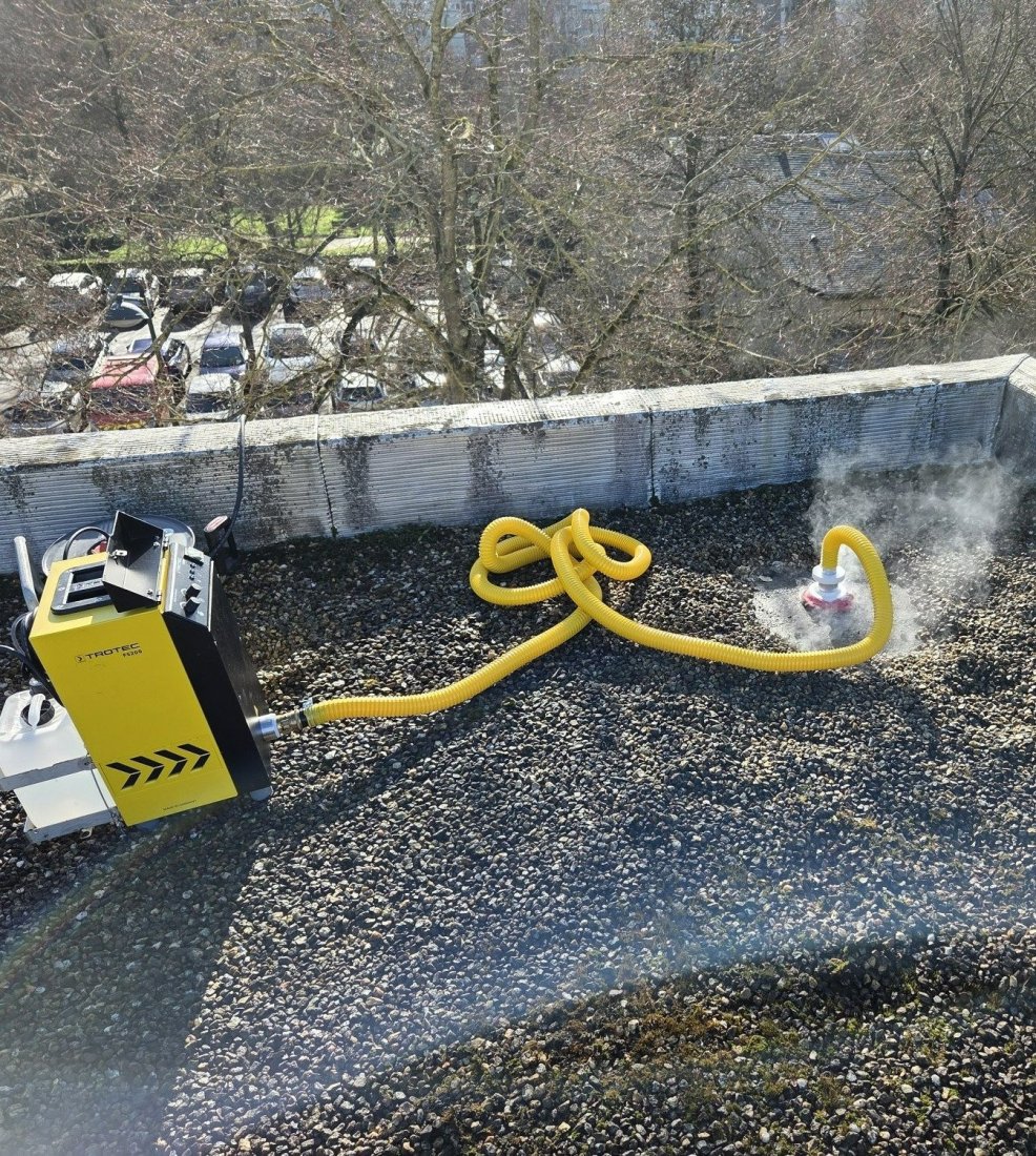 Pour résoudre ce problème, nous avons utilisé la méthode du test fumigène. Concrètement, nous avons insufflé de la fumée sous la membrane bitumineuse d’étanchéité. Ce procédé permet de visualiser très précisément le point de sortie de la fumée, qui coïncide avec le défaut d’étanchéité, notamment au niveau des acrotères ou des relevés. Grâce à cette technique, nous avons pu intervenir de façon ciblée, limitant les travaux de réparation uniquement à la zone défectueuse pour un résultat rapide, fiable et durable.