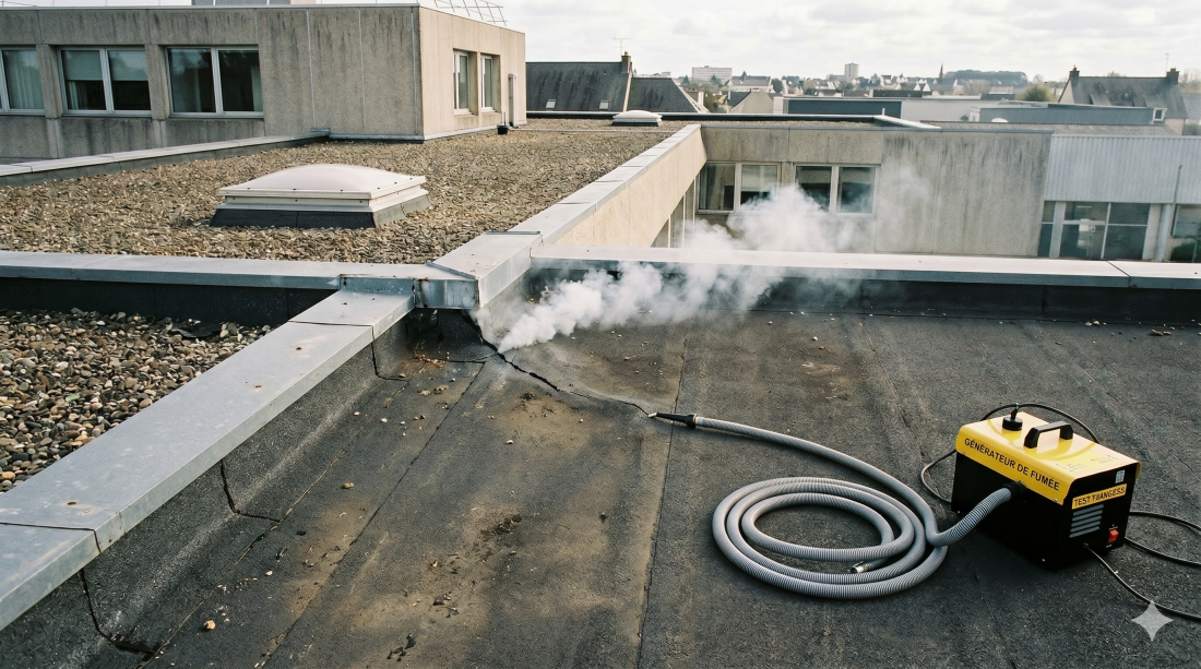Détection précise d’une fuite sur toiture-terrasse à Saint-Grégoire grâce au test fumigène : la fumée révèle un défaut d’étanchéité sur la membrane bitumineuse, évitant ainsi infiltration et dégradation de l’isolant.